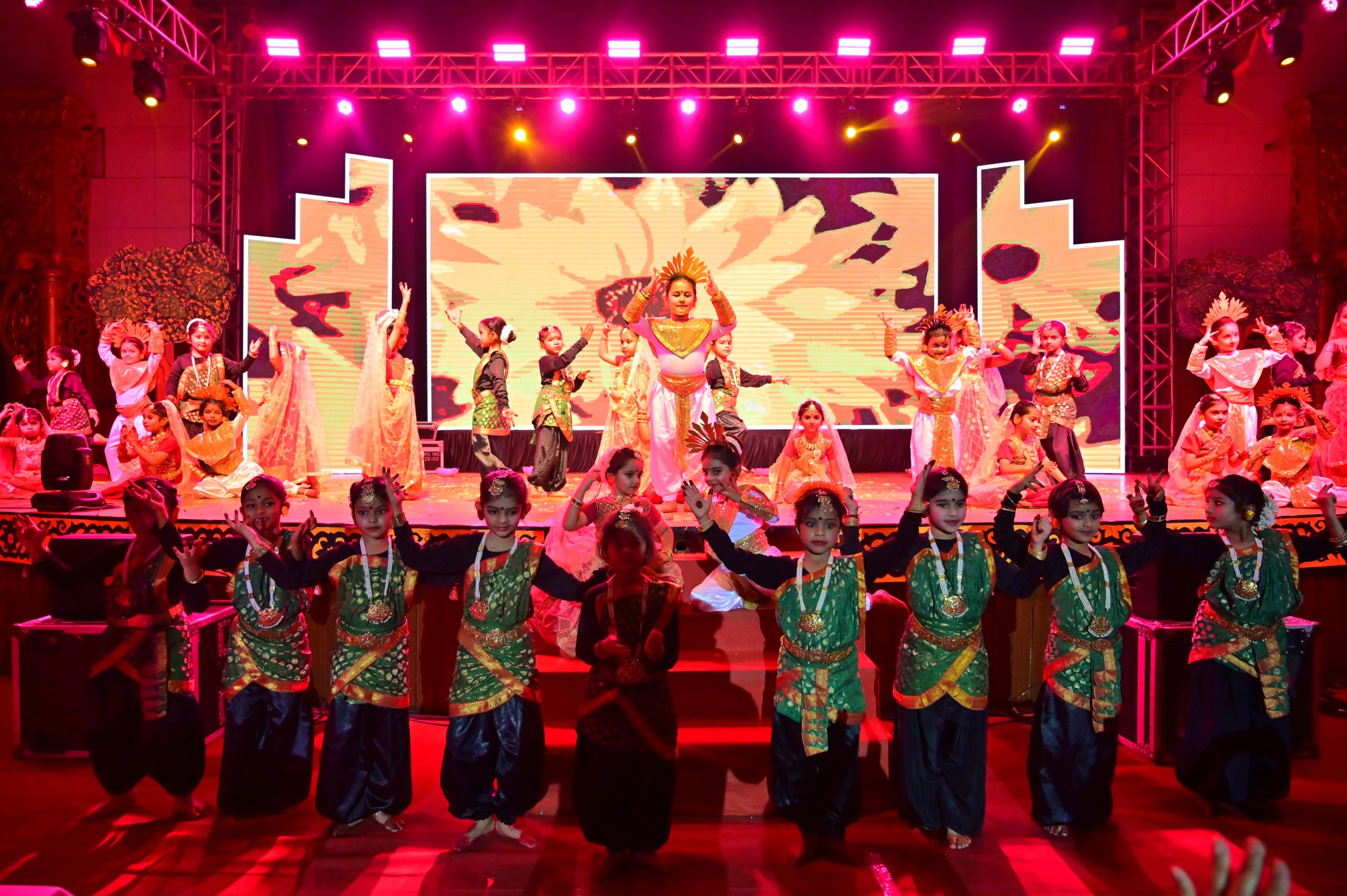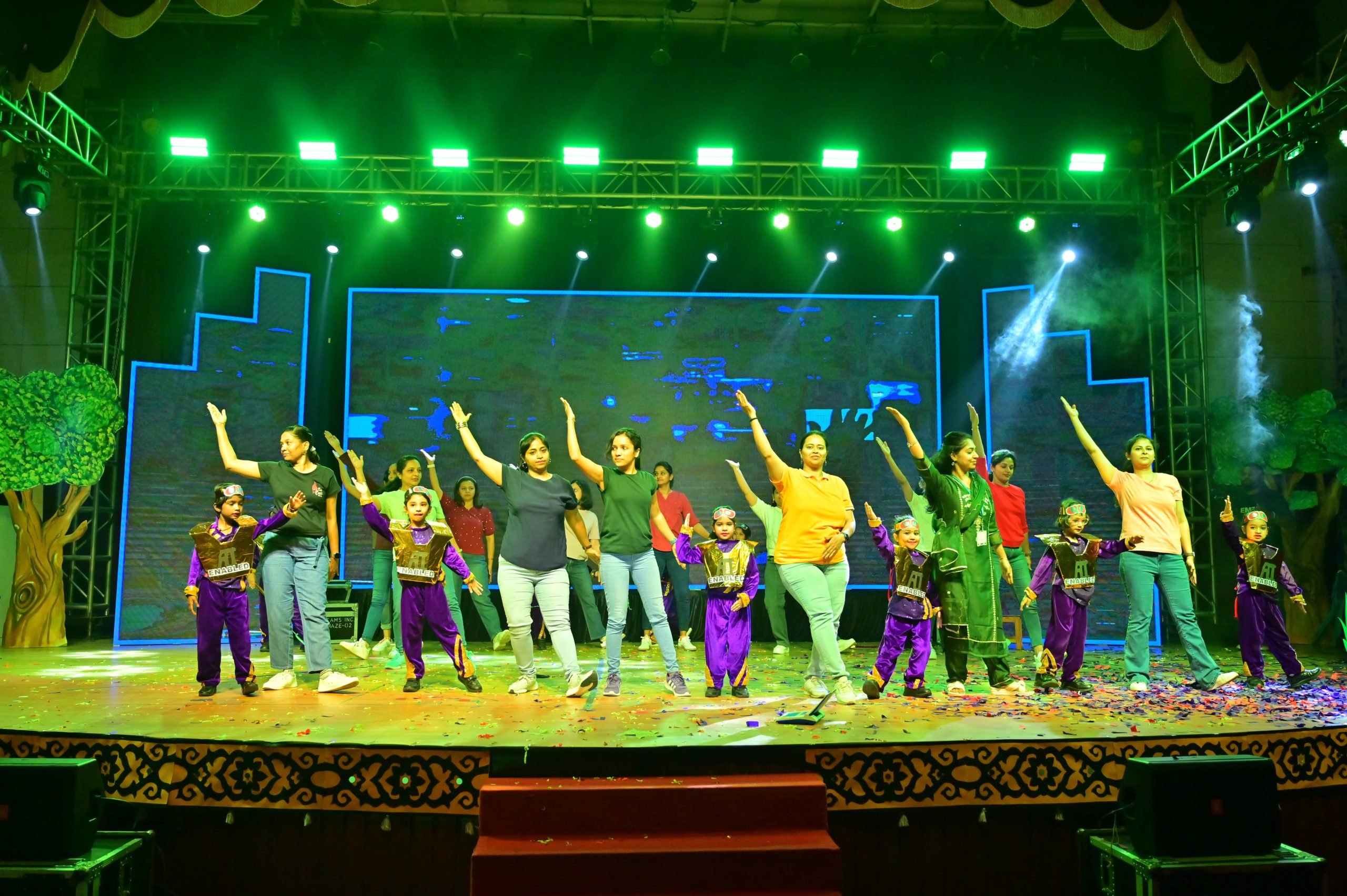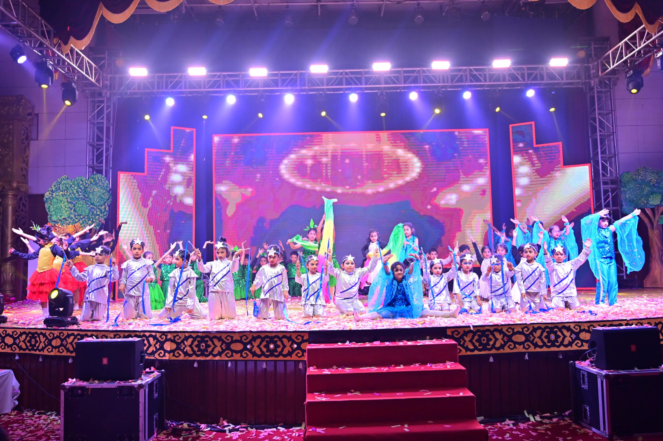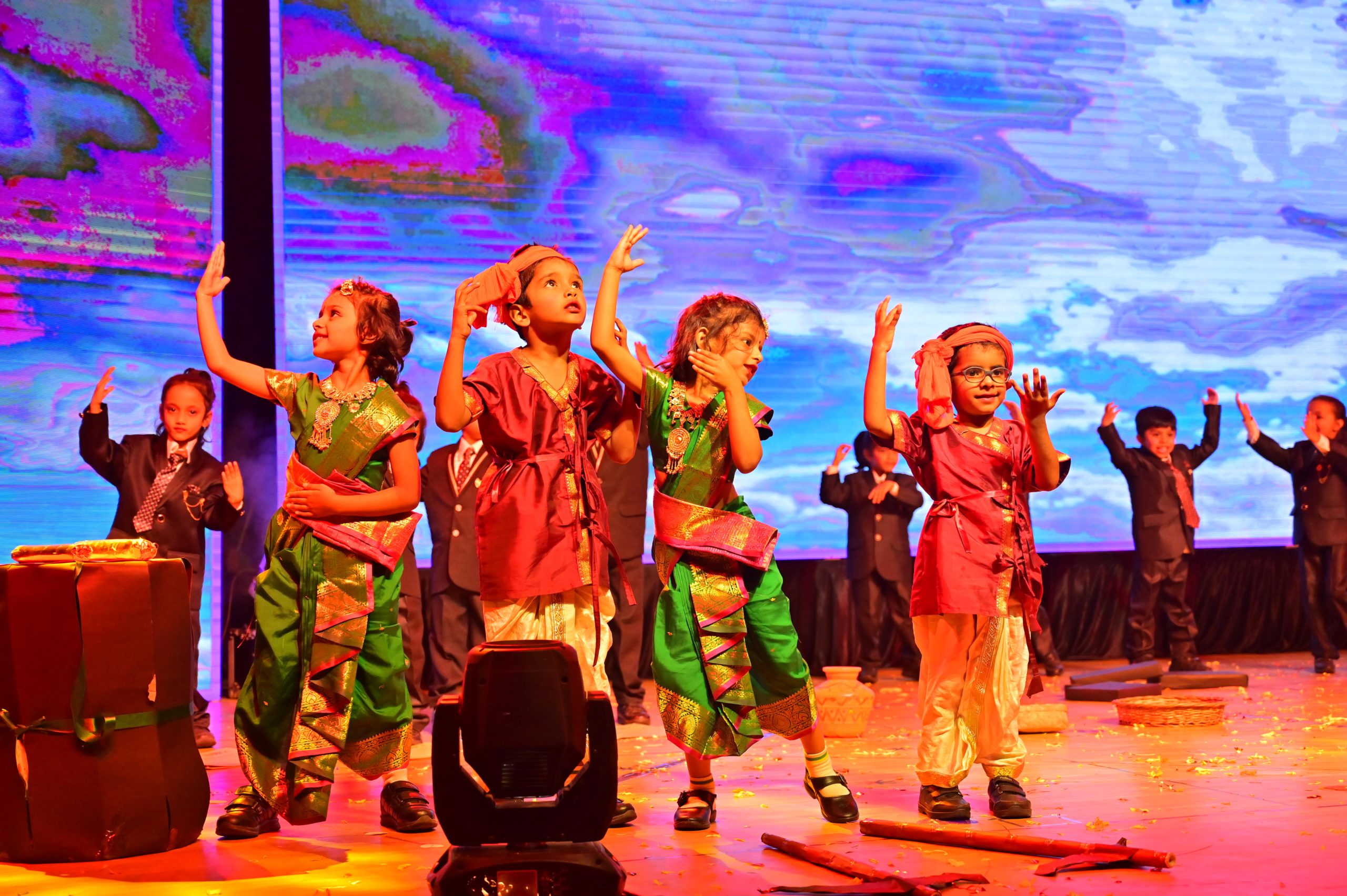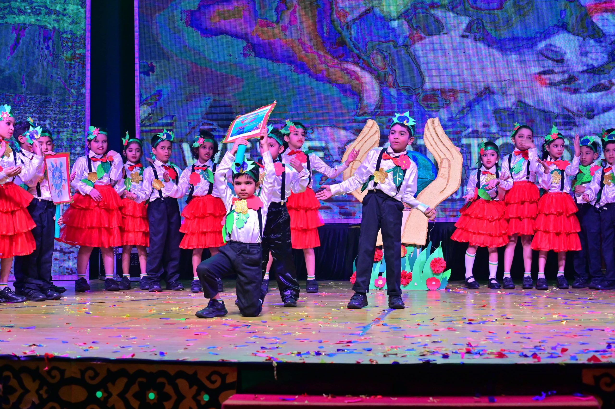 The evening began with the ceremonial lighting of the lamp, followed by a harmonious choir performance, setting the stage for a vibrant and thought-provoking journey. Through the symbolic figures of the Timekeeper and Earth Spirit, students took the audience through Earth’s past, present challenges, and a hopeful future, emphasizing environmental responsibility and sustainability. 🌱💡