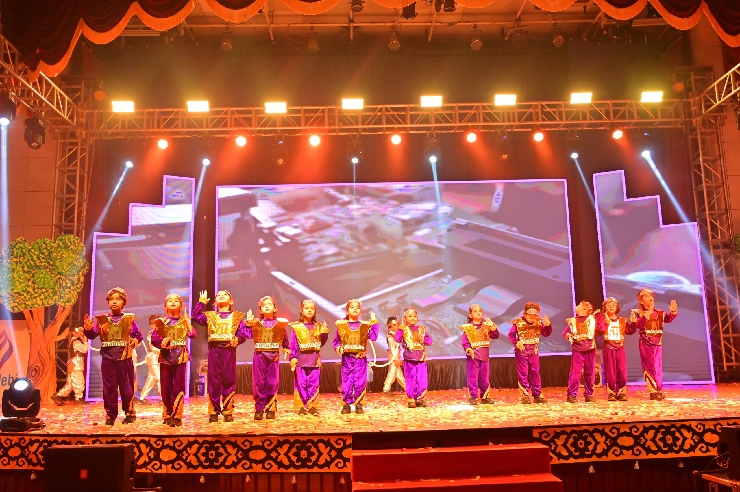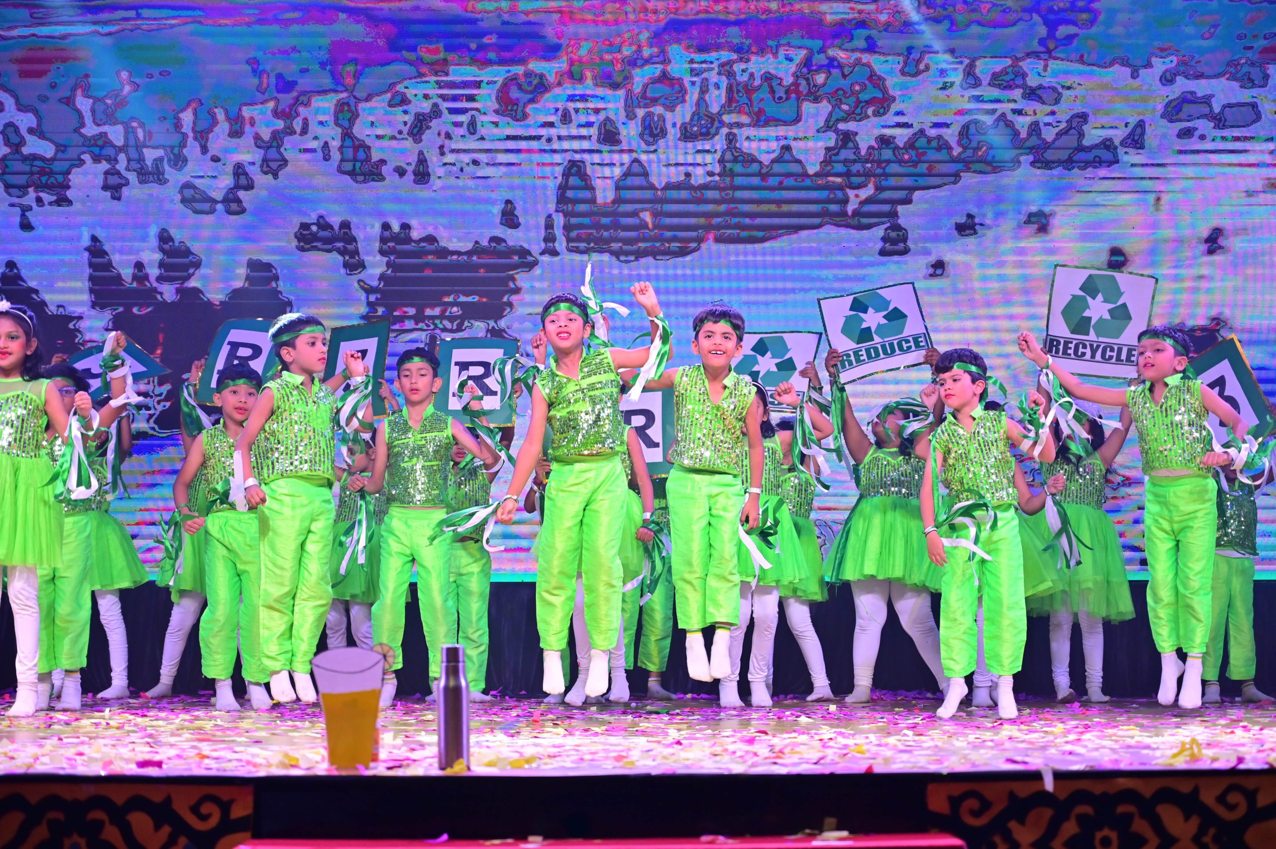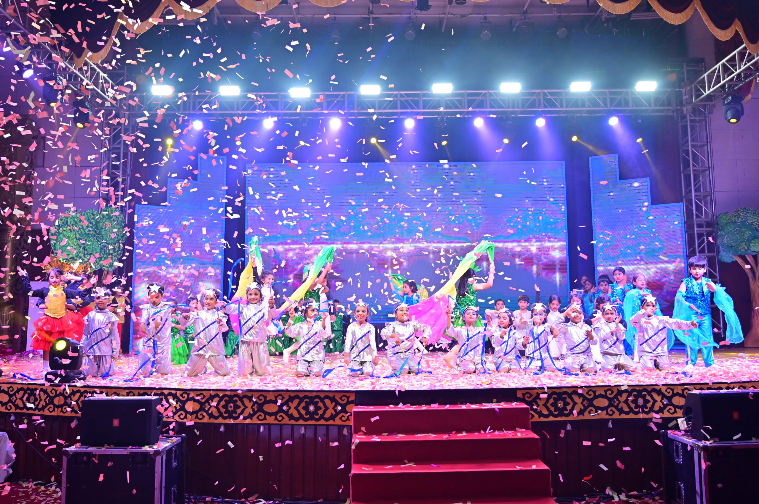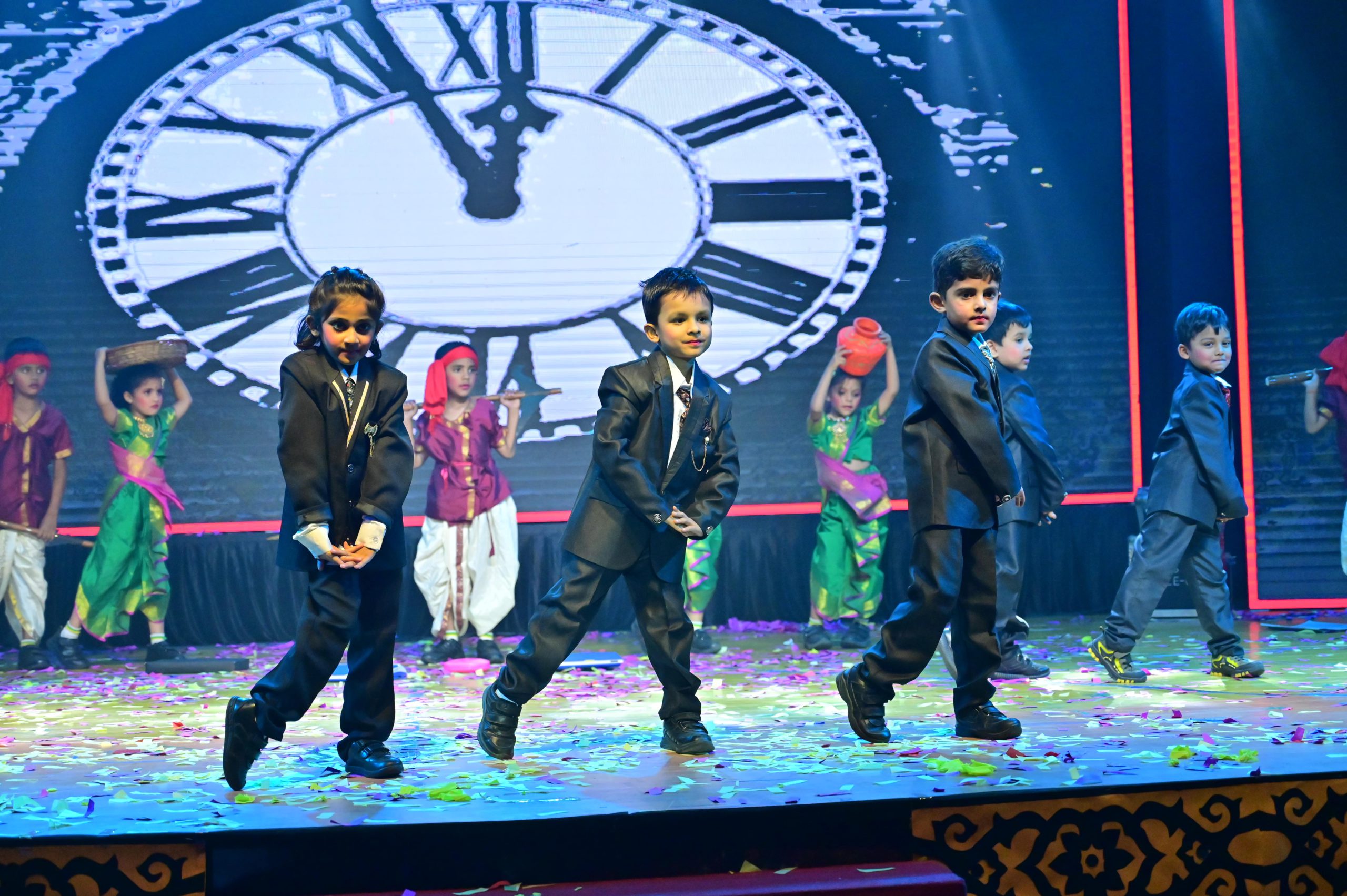 The evening began with the ceremonial lighting of the lamp, followed by a harmonious choir performance, setting the stage for a vibrant and thought-provoking journey. Through the symbolic figures of the Timekeeper and Earth Spirit, students took the audience through Earth’s past, present challenges, and a hopeful future, emphasizing environmental responsibility and sustainability. 🌱💡