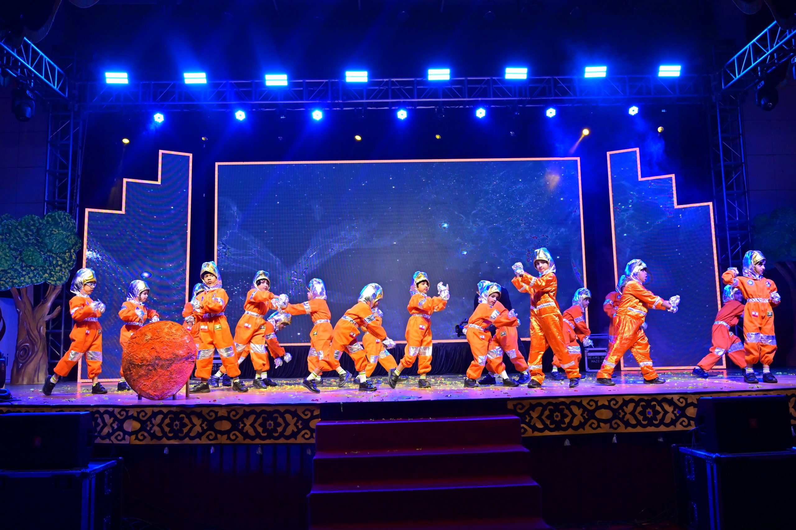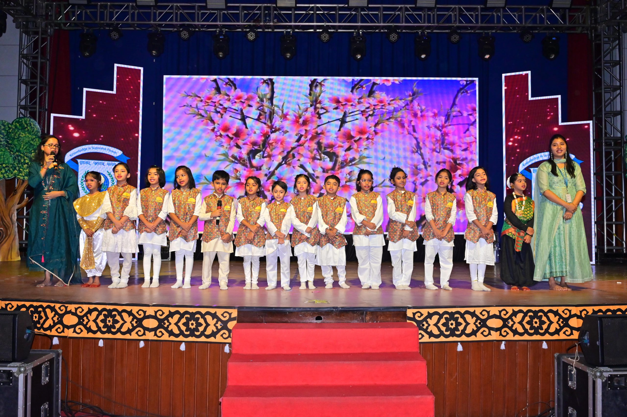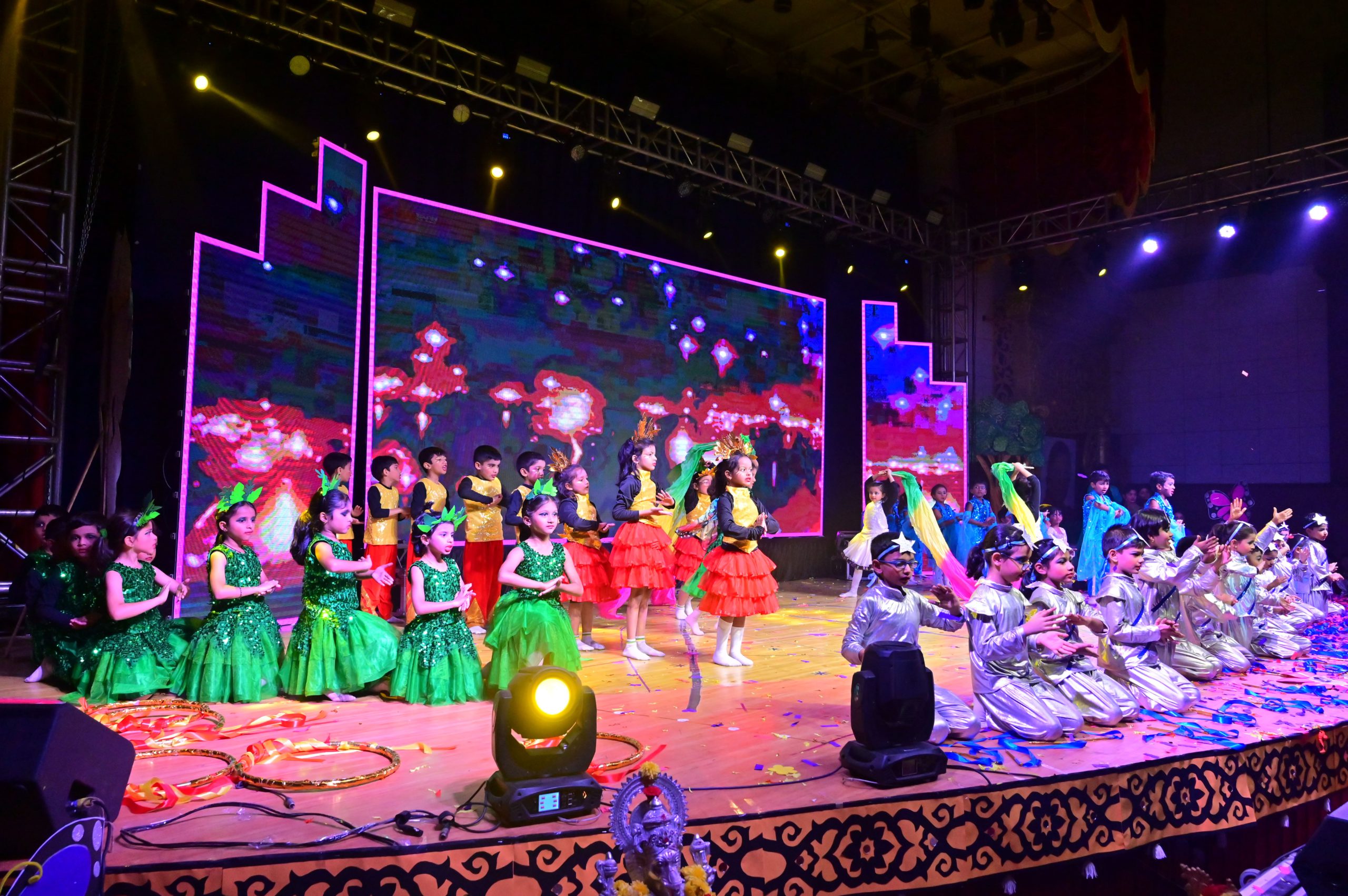 The evening began with the ceremonial lighting of the lamp, followed by a harmonious choir performance, setting the stage for a vibrant and thought-provoking journey. Through the symbolic figures of the Timekeeper and Earth Spirit, students took the audience through Earth’s past, present challenges, and a hopeful future, emphasizing environmental responsibility and sustainability. 🌱💡