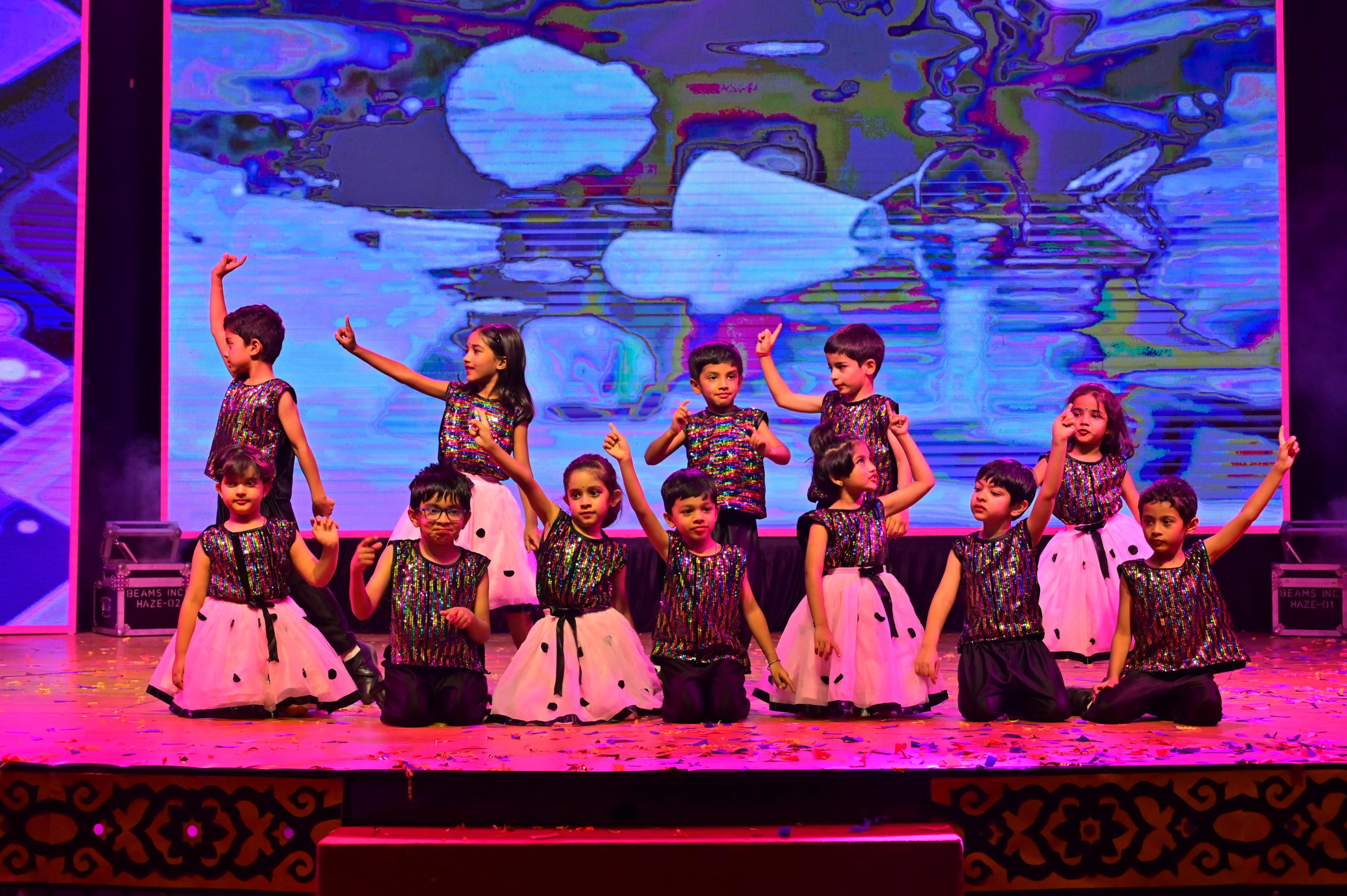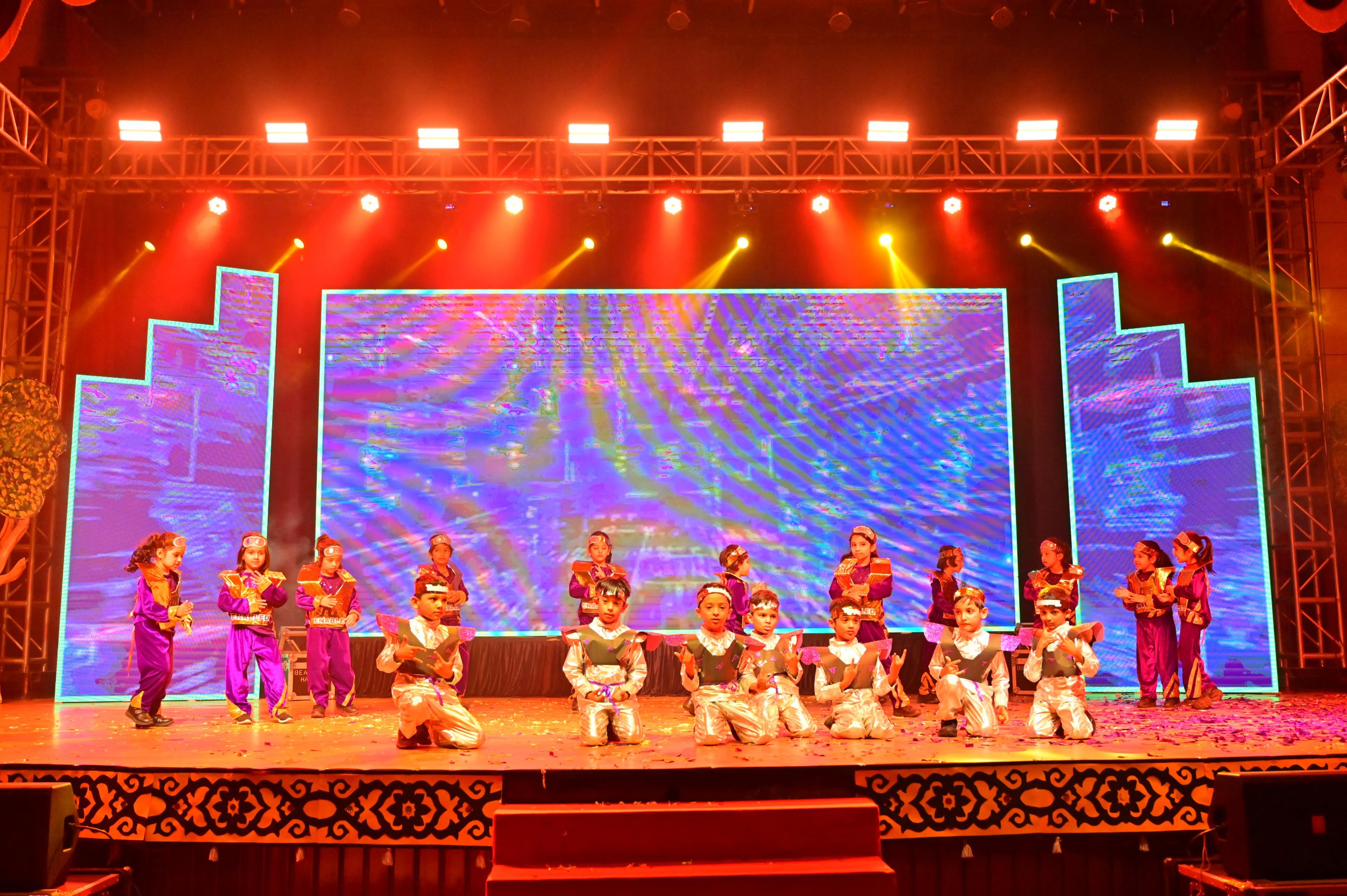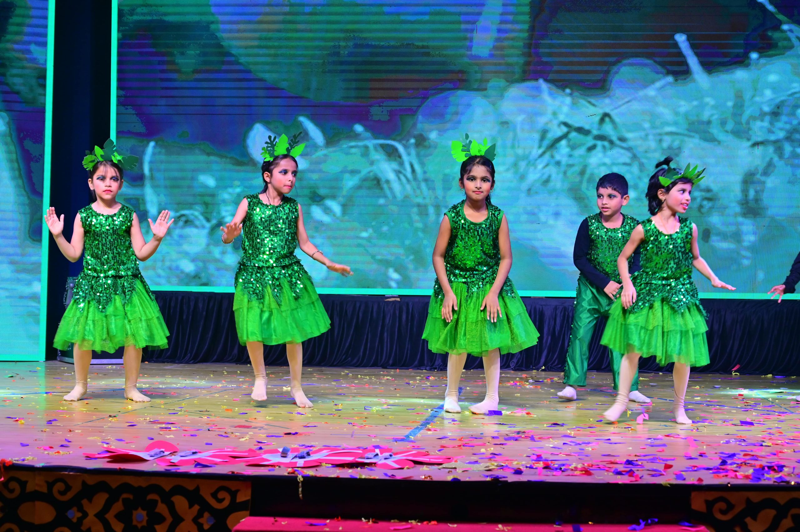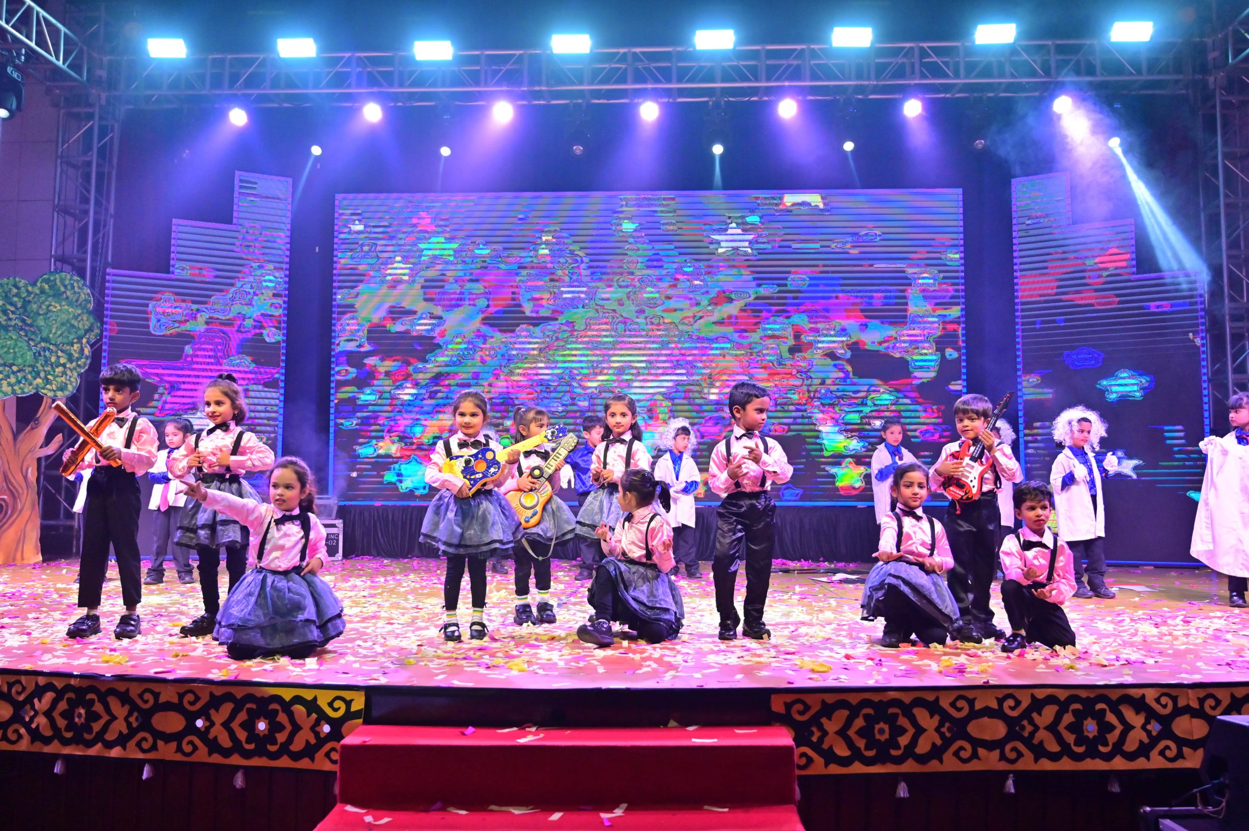 The evening began with the ceremonial lighting of the lamp, followed by a harmonious choir performance, setting the stage for a vibrant and thought-provoking journey. Through the symbolic figures of the Timekeeper and Earth Spirit, students took the audience through Earth’s past, present challenges, and a hopeful future, emphasizing environmental responsibility and sustainability. 🌱💡