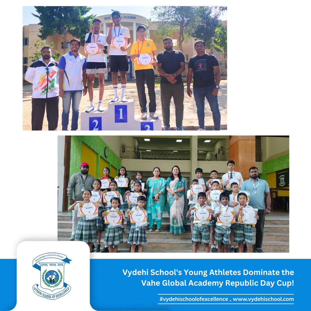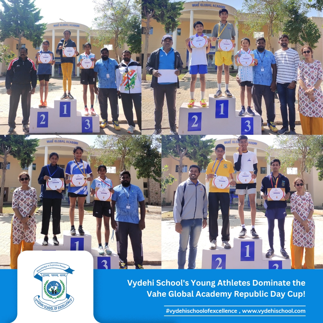 “Our talented athletes displayed incredible determination and skill at the Vahe Global Academy Republic Day Cup – Kids Athletic Meet, held at VGA Sports Ground, Varthur. Competing across multiple events, our Vydehians brought home a fantastic haul of medals and trophies, making us immensely proud!