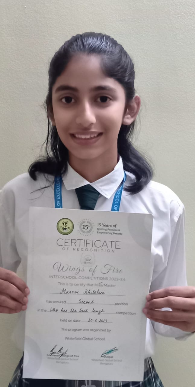 Champions do not become champions when they win the event, but in the hours, weeks, months and years they spend preparing for it. The victorious performance itself is merely the demonstration of their championship character. Rightly said by John.W.Holt-“If you’re not making mistakes, you’re not taking risks, and that means you’re not going anywhere. The key is to make mistakes faster than the competition, so you have more changes to learn and win.” Taking risks play an important role in learning. When we take risk through participating in any competition, we set such high standards for ourselves, that we have to go out every day and live up to that. Vydehi School students participated in an Interschool Competition- Wings Of Fire, organised by Whitefield Global School on 30th June,2023 and 1st July, 2023. They had organised for Cultural events like Fleet Clan, Ek Paatra Abhinaya, RJ Funny Bone, and Who has the Last Laugh? The students of middle school participated in all of the above events and Proudly bagged the second position in Fleet Clan. It is a group dance competition participated by Vydehians like Sinchana P., Siri Hemanth, Lakshmi S., Priyanshi Bhatnagar, Manasvini V., Bhadra Sethukumar, Lakshmi Jenny R. and Lola Manasvi. They proved their strength with their finese and postures and team co-ordination. Maanvi Khilolani of grade 6 secured the second position in Who has the last Laugh? She delivered a stand up comedy and took the judges on a hilarious ride managing to tickle the funny bone with her humourous words.