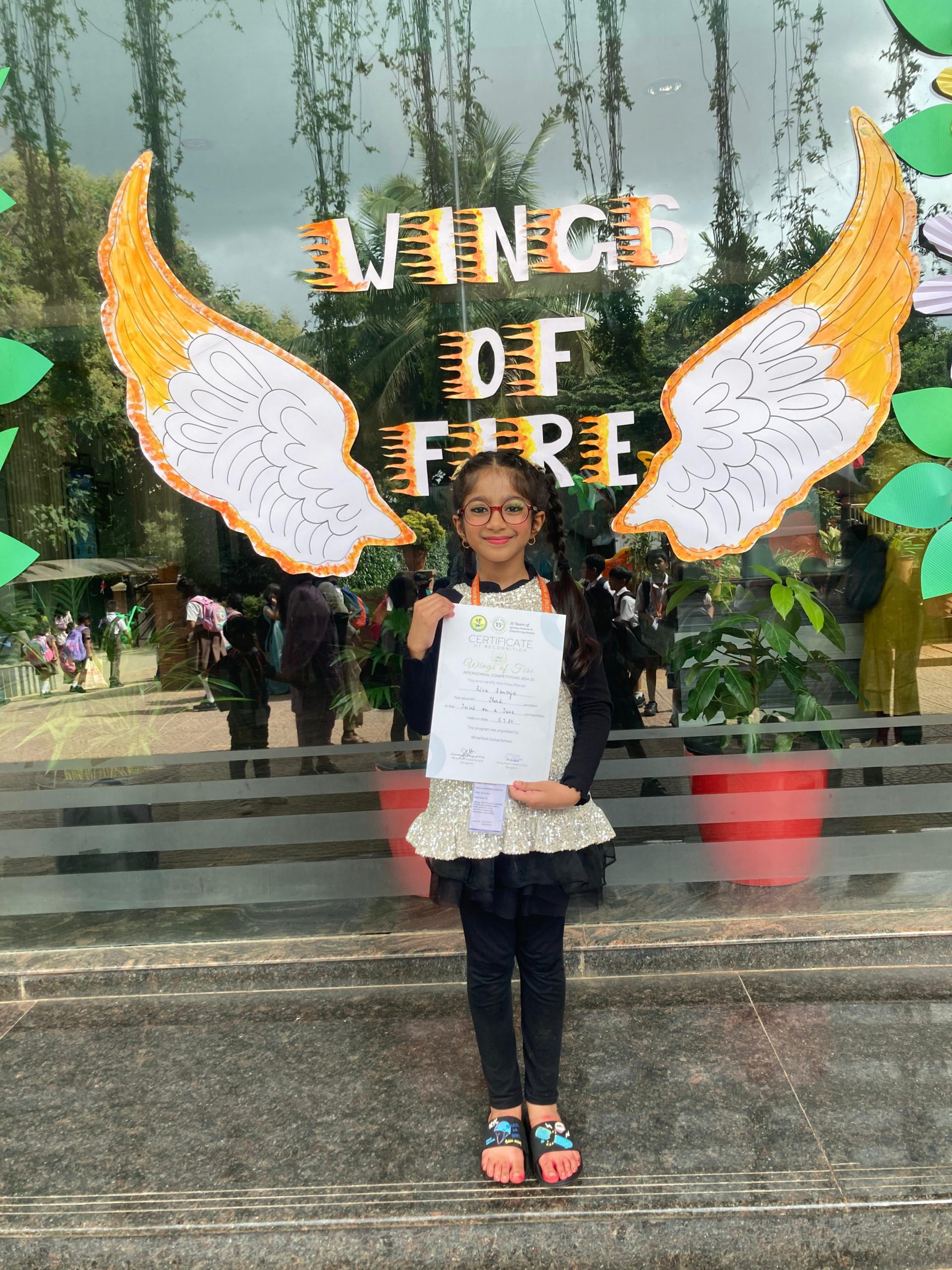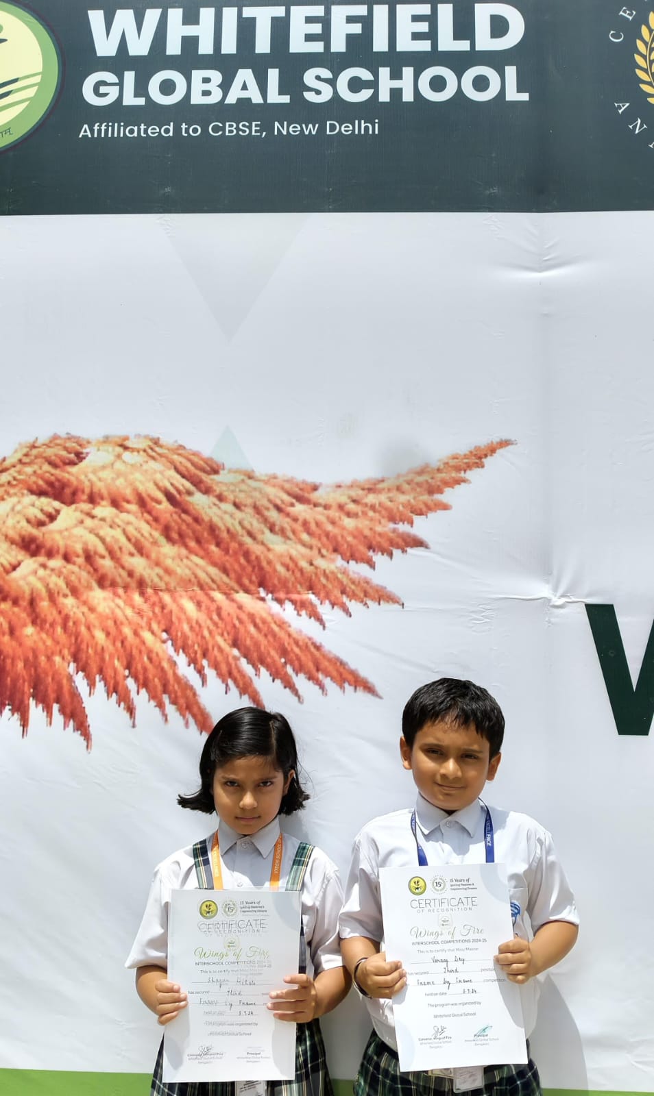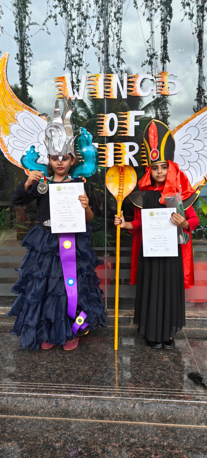 The “Wings of Fire” inter-school competition took place at Whitefield Global School on the 5th and 6th of this month. Among the many events, two students from Grade II participated in “FANTASY COMES ALIVE,” where they portrayed their favourite fairy tale characters. Ishi Pandey from II J secured second place, and Zoreza Jannat Hussain from II G won the best costume award.